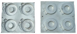 Production molds can be machined from billet or cast aluminum, Metapor® porous aluminum, Teflon®, Delrin® or any combination of these. Aluminum molds are machined with vacuum channels and manifolding. Plug assists can be machined from any combination of materials. At right is an example of a mold with aluminum cavity and a plug assist of aluminum supporting Teflon. |
